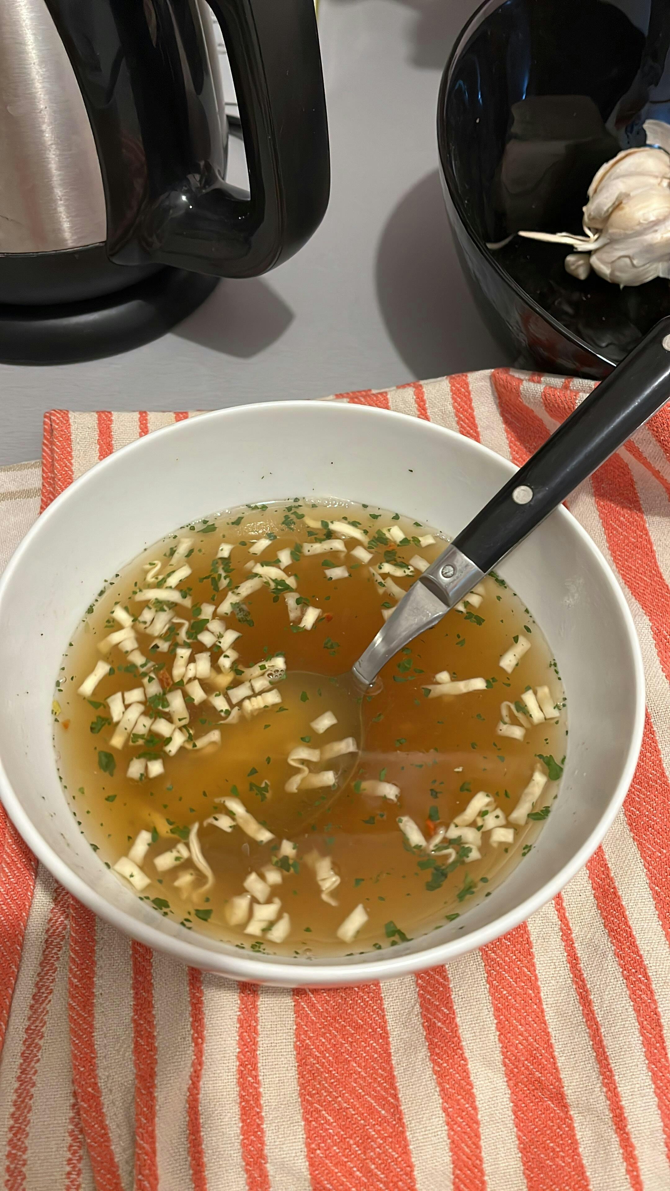 Une soupe légère et hydratante aux notes asiatiques, agrémentée de petites pâtes.